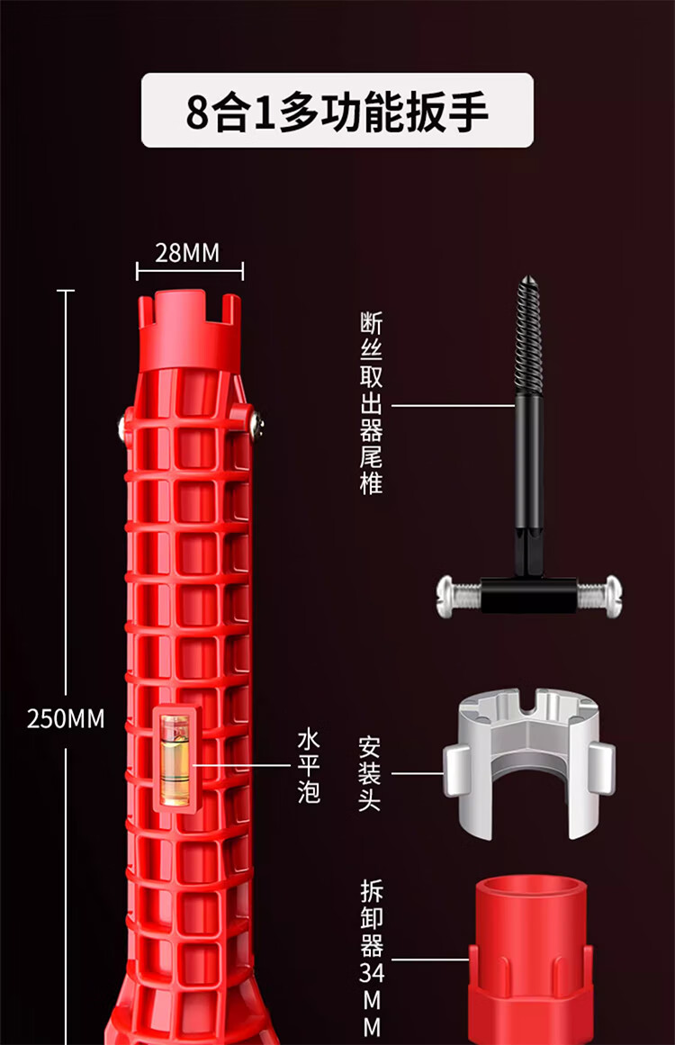 > 多功能水槽扳手5合1水龙头洗手盆松安装水管角阀下水管扳手维修